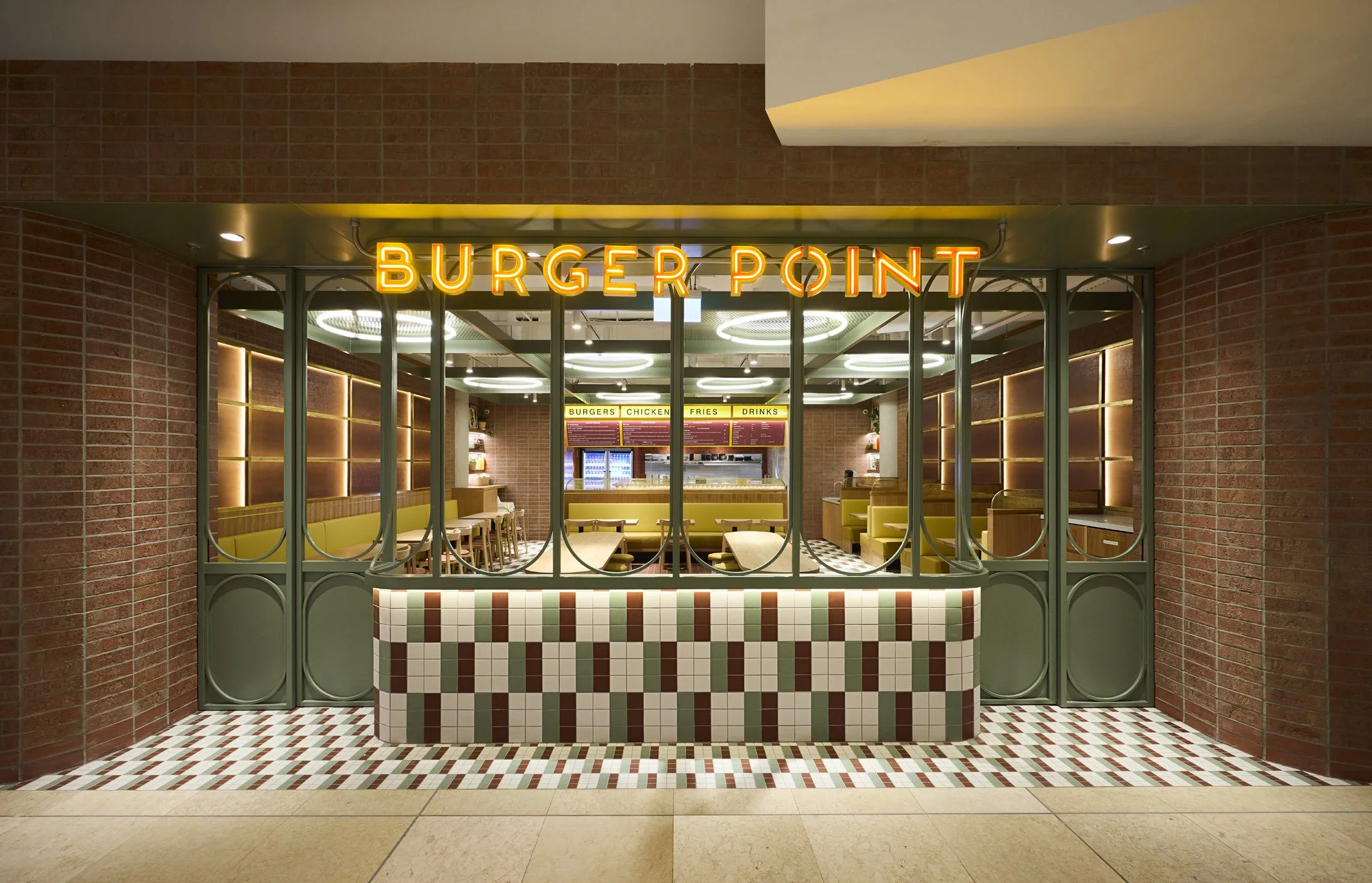 The open ceiling design includes a lowered grid painted in green, complemented by round linear lighting for a contemporary touch. The timber-framed shopfront takes inspiration from classic diners, incorporating rounded arches and sleek metal trims.